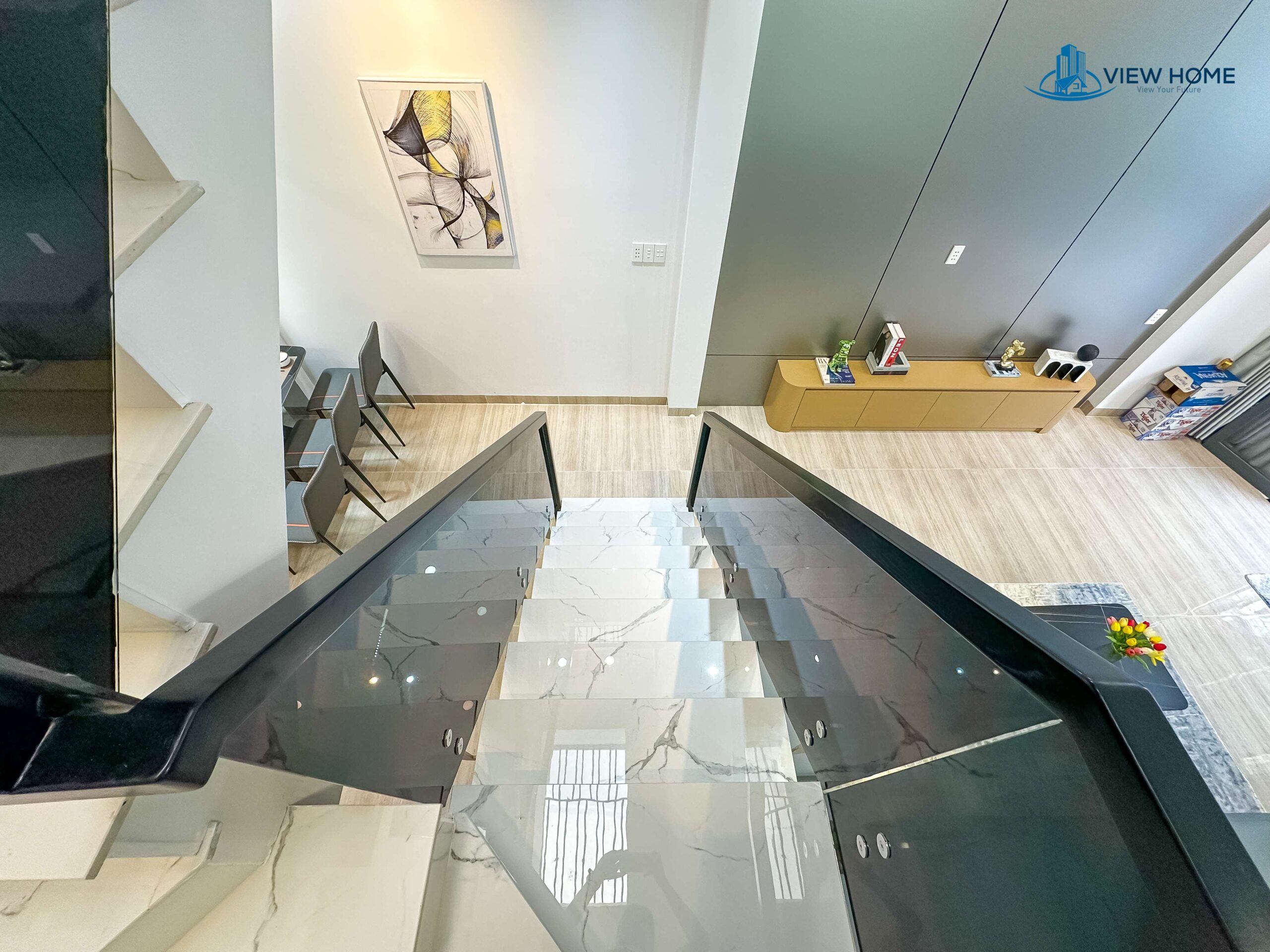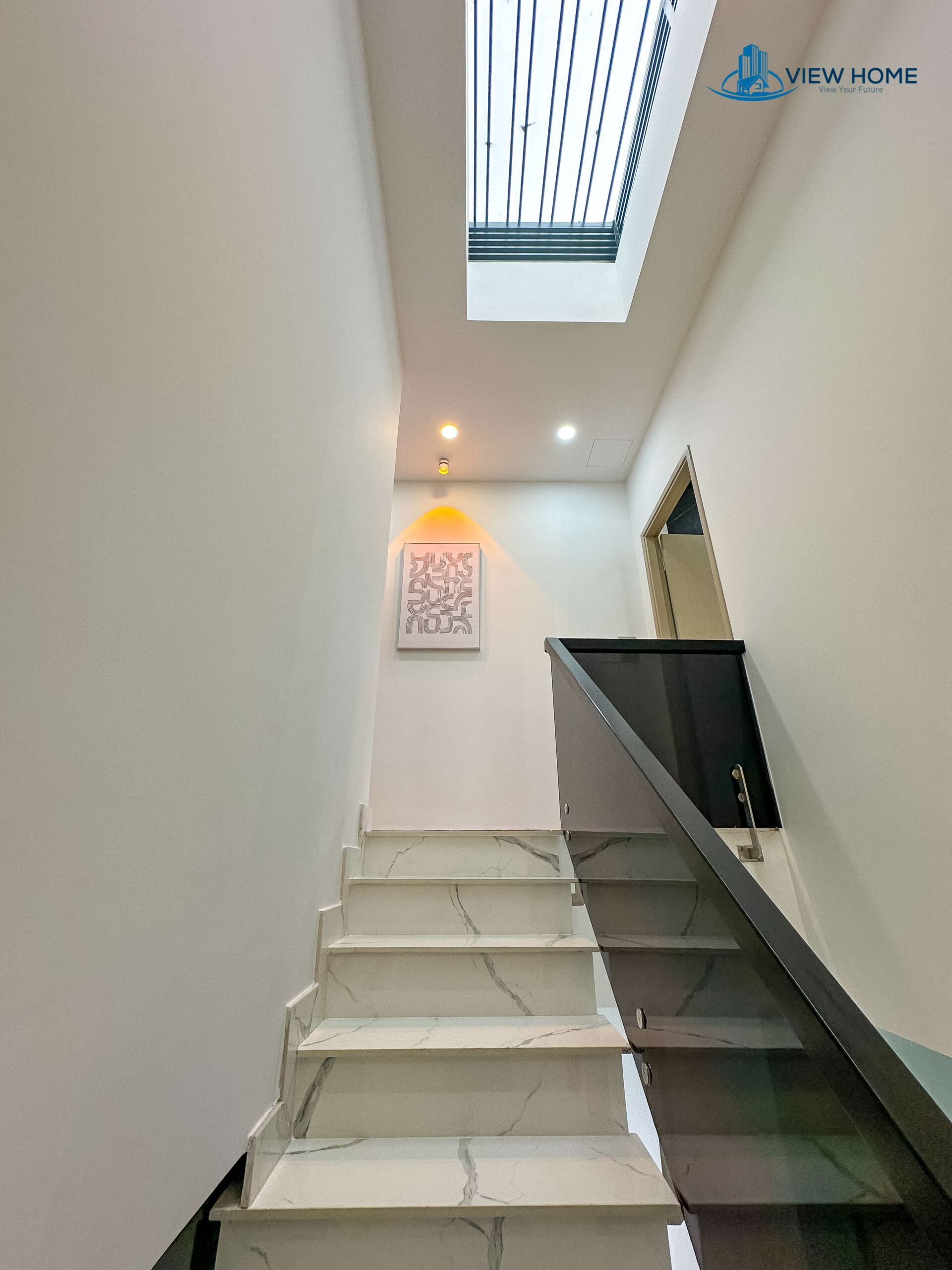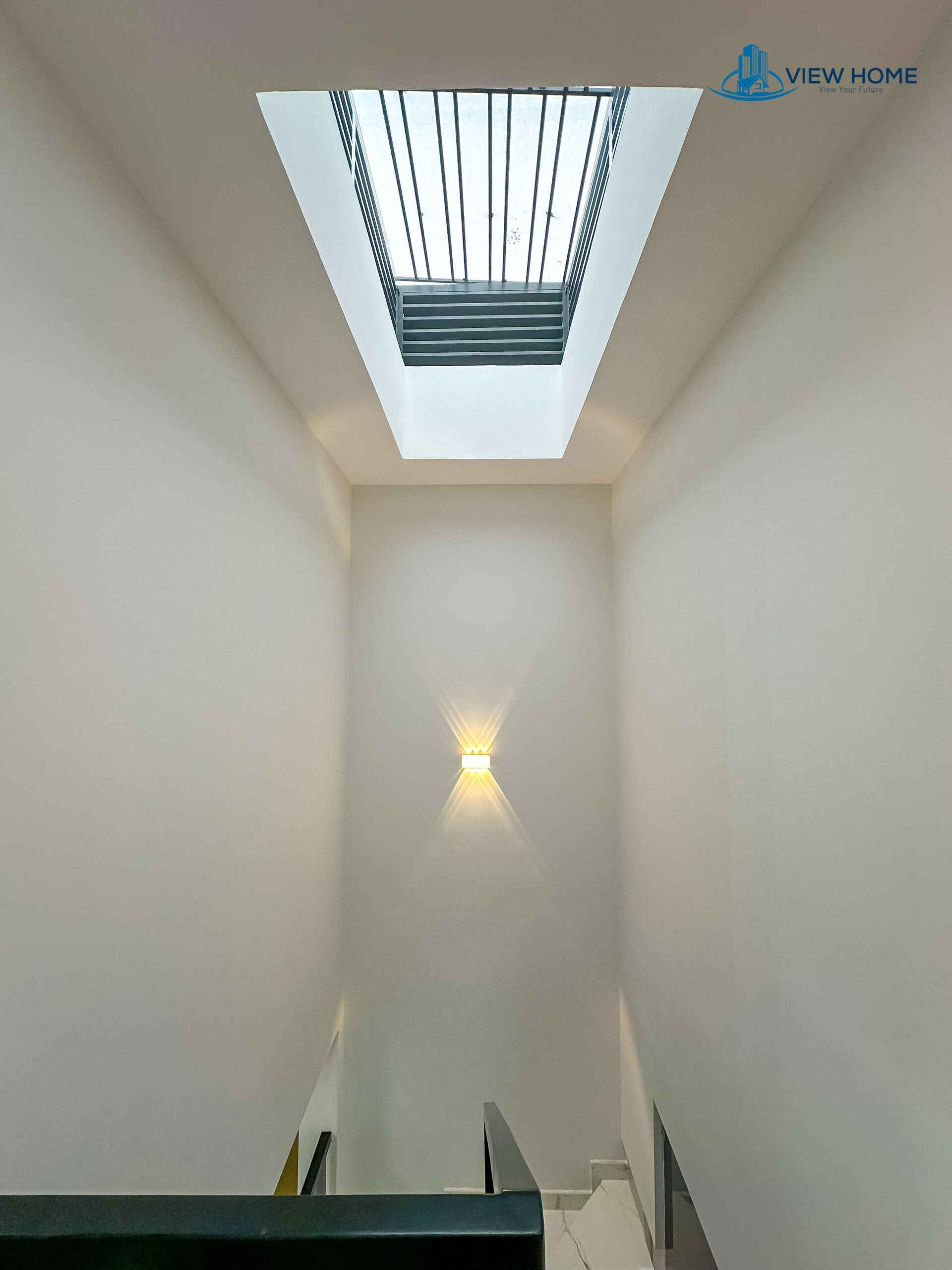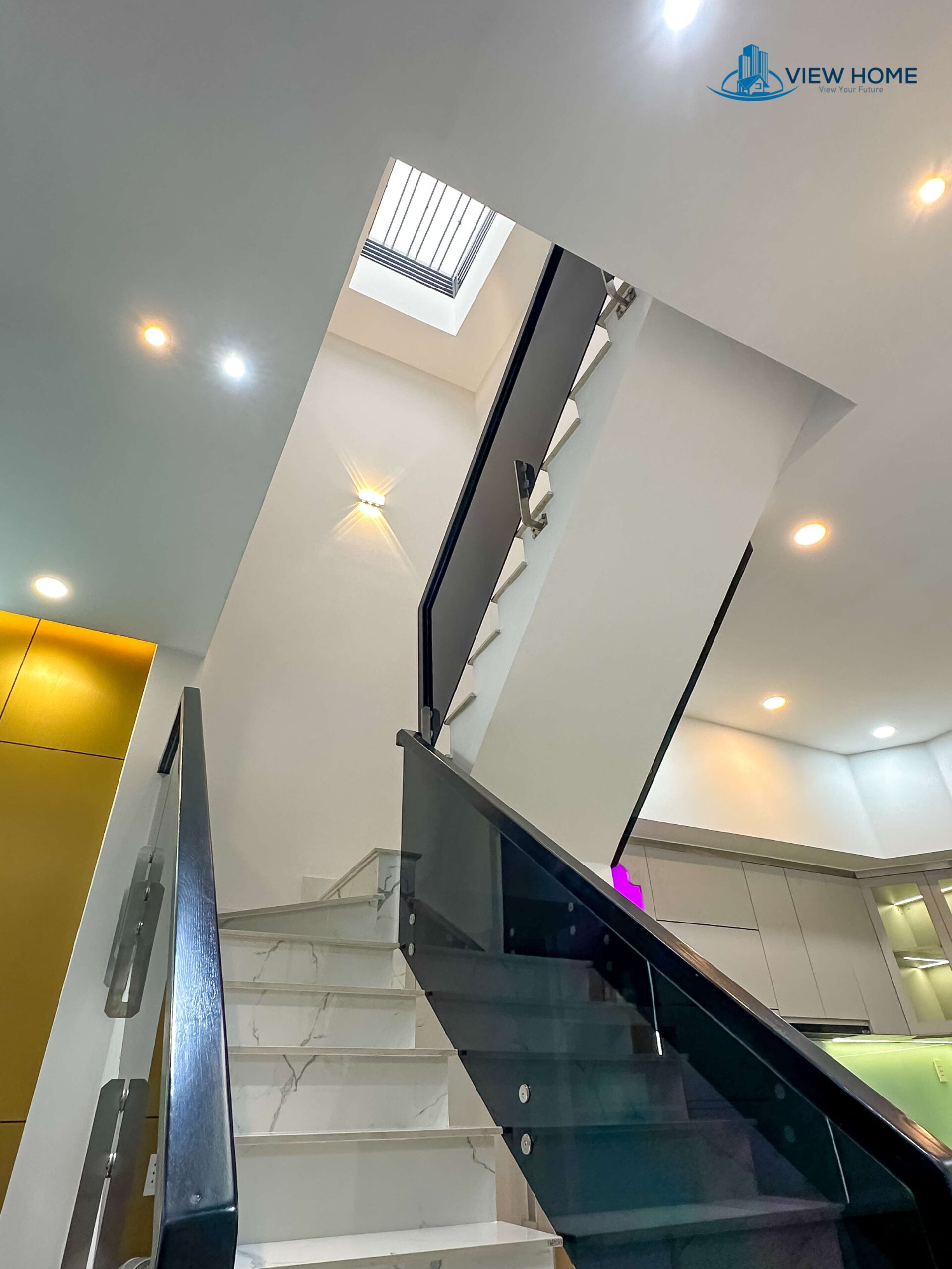 Tầng trệt : phòng khách , cầu thang bên trái nhà giúp căn nhà rộng rãi và thoáng đãng . Tiếp đến là không gian bếp mở rộng với phòng khách tạo không gian mở ấm cúng và hiện đại. Sau khoảng bếp là tolet và giếng trời . FULL Nội Thất đồng bộ