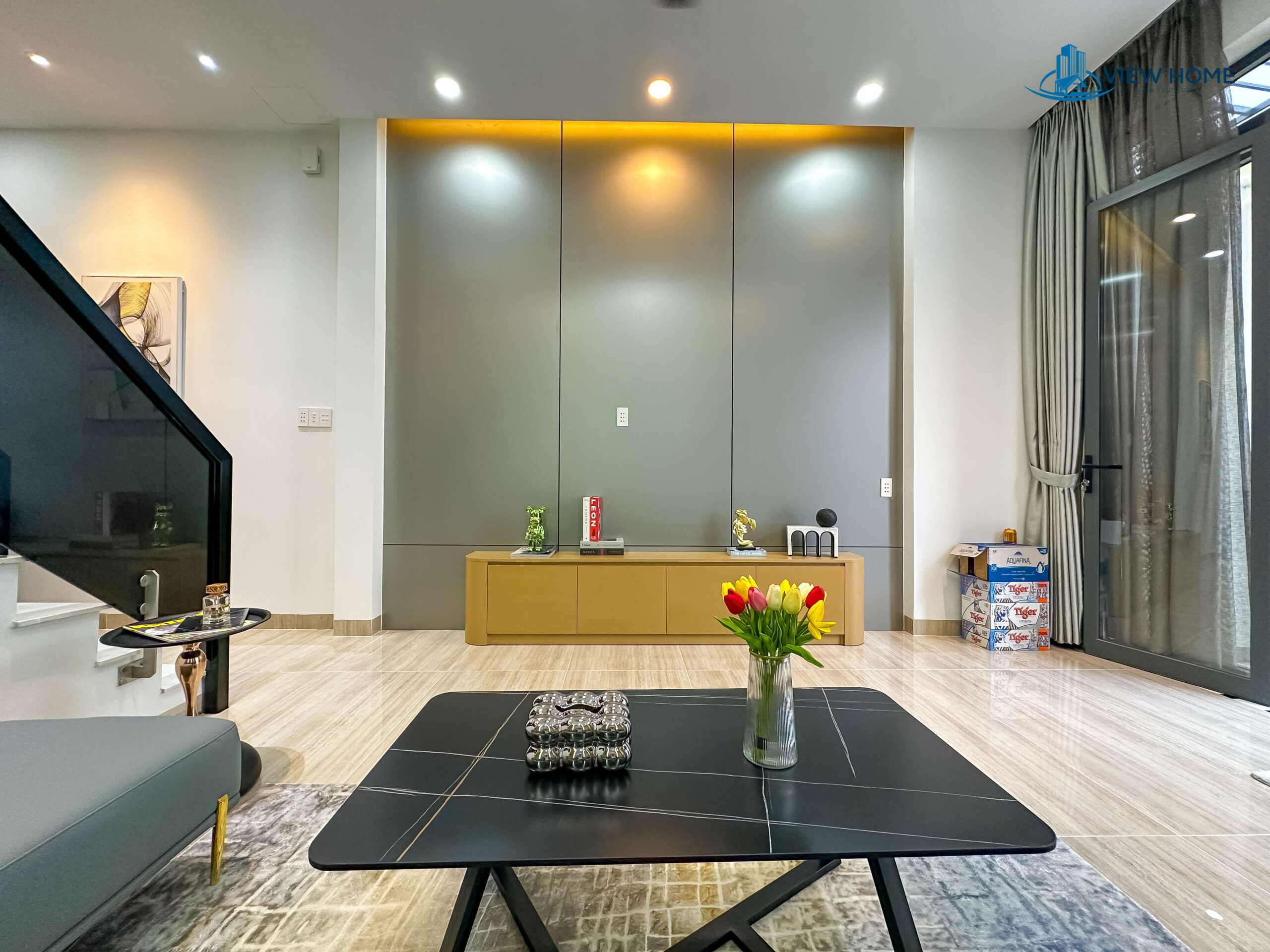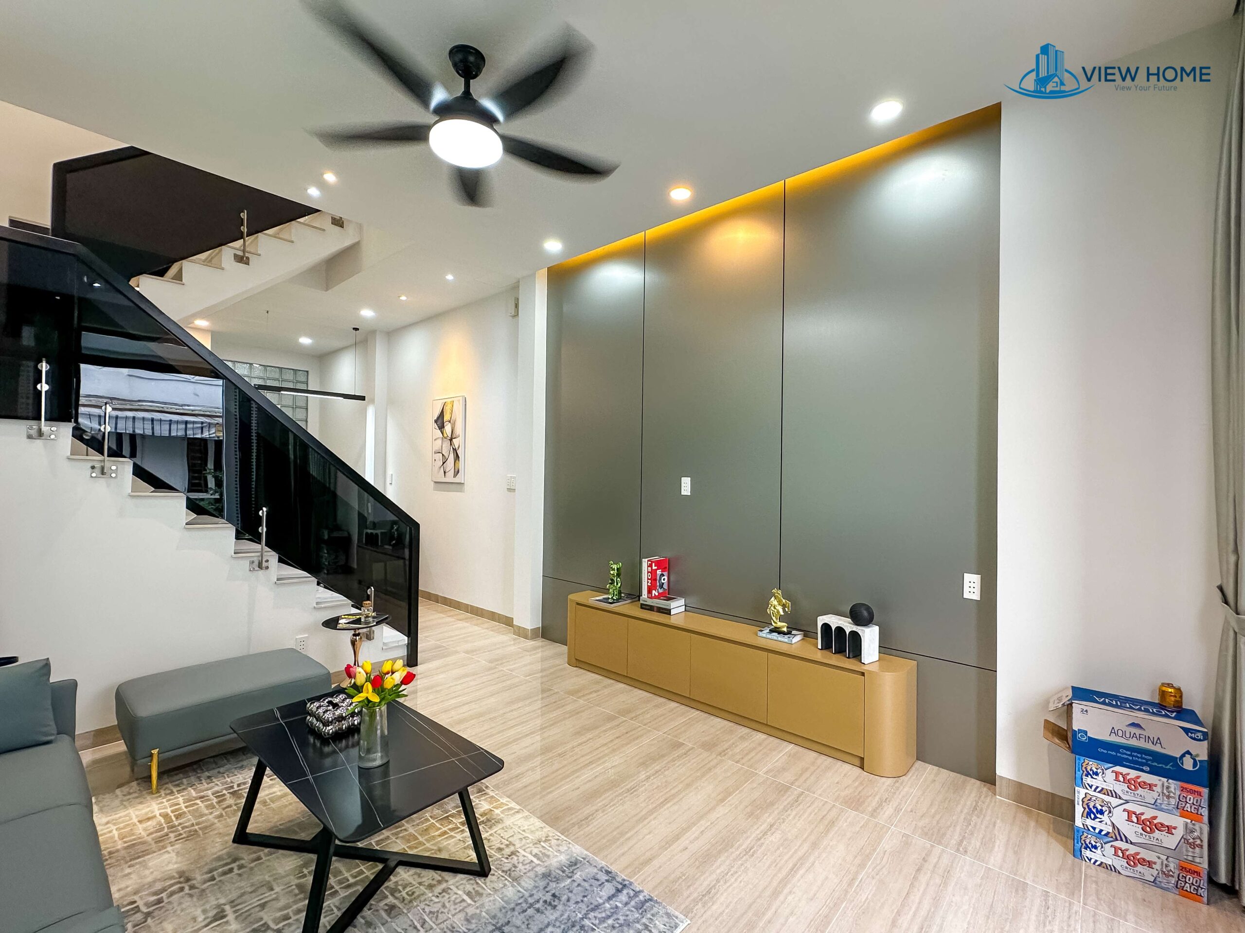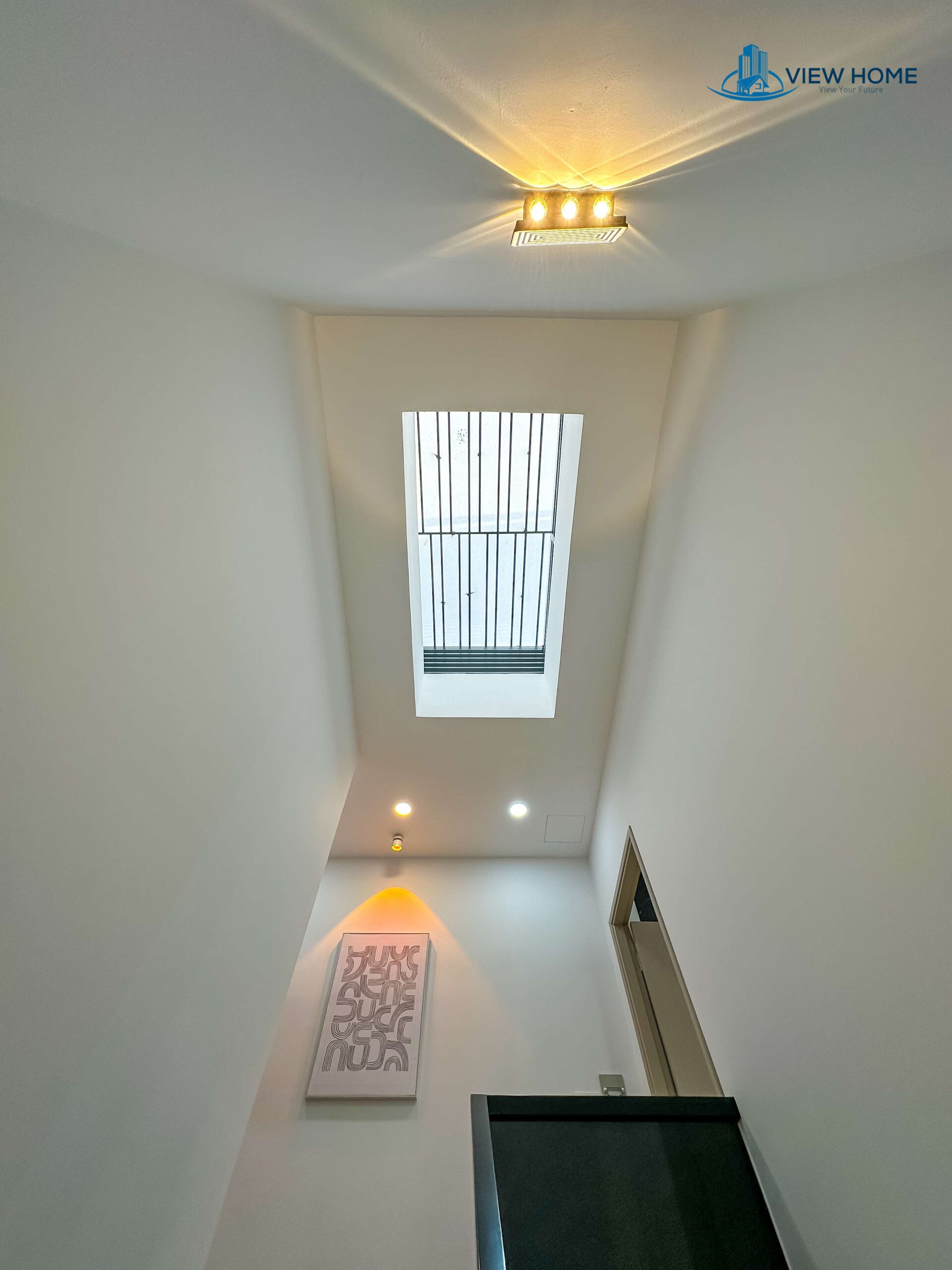 Tầng trệt : phòng khách , cầu thang bên trái nhà giúp căn nhà rộng rãi và thoáng đãng . Tiếp đến là không gian bếp mở rộng với phòng khách tạo không gian mở ấm cúng và hiện đại. Sau khoảng bếp là tolet và giếng trời . FULL Nội Thất đồng bộ