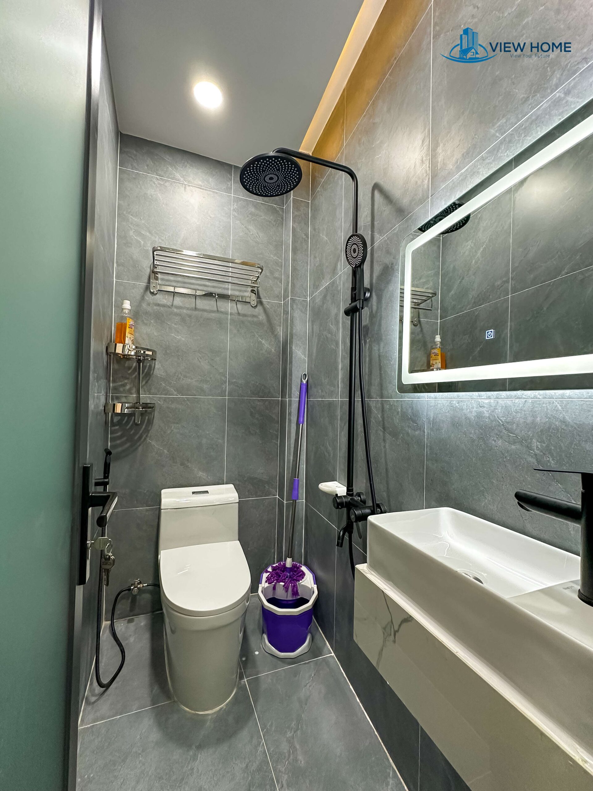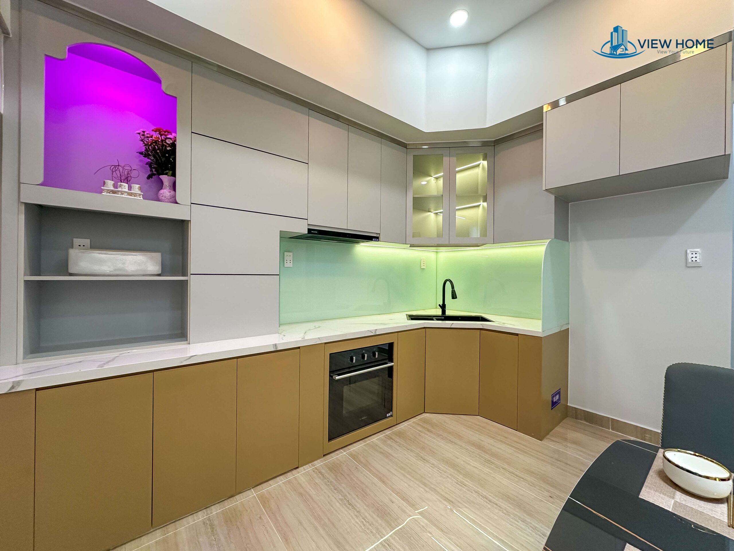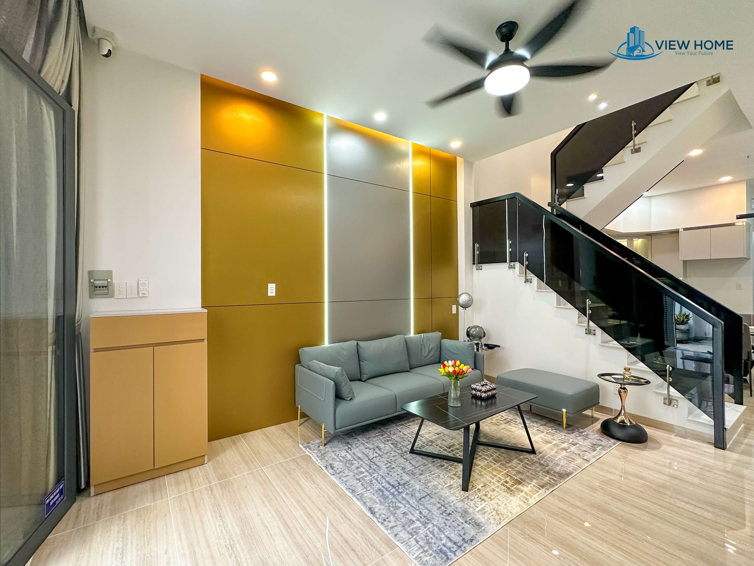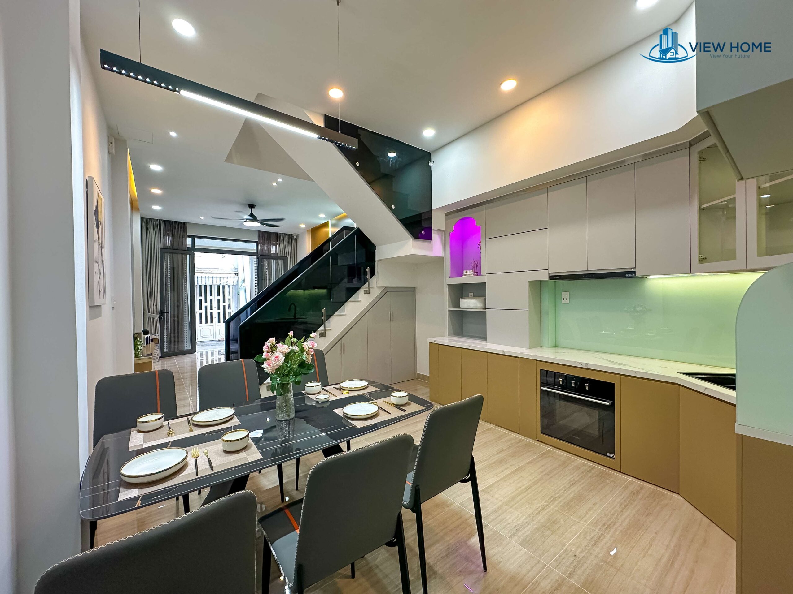 Tầng trệt : phòng khách , cầu thang bên trái nhà giúp căn nhà rộng rãi và thoáng đãng . Tiếp đến là không gian bếp mở rộng với phòng khách tạo không gian mở ấm cúng và hiện đại. Sau khoảng bếp là tolet và giếng trời . FULL Nội Thất đồng bộ
